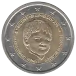 Visage de Liam Vanden Branden, enfant de 2 ans disparu en 1996 et jamais retrouvé[32]. À gauche, la légende trilingue MISSING-DISPARU-VERMIST. À droite l'URL du site de l'organisation non gouvernementale Child Focus WWW.CHILDFOCUS.BE. En haut la mention trilingue du pays émetteur BELGIQUE•BELGIE•BELGIEN. L'anneau externe de la pièce comporte les douze étoiles du drapeau européen.