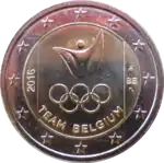 Logo de l'équipe olympique belge, composé d'un athlète stylisé portant le drapeau belge sur les épaules, au-dessus des anneaux olympiques et de la légende en anglais TEAM BELGIUM (équipe Belgique). À gauche, à la verticale, le millésime 2016. À droite, la mention du pays émetteur BE. L'anneau externe de la pièce comporte les douze étoiles du drapeau européen. | ||||||