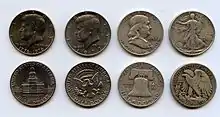 Différentes versions du demi-dollar (de gauche à droite ) : Kennedy Bicentennial (1976), Kennedy courante (1971), Franklin (1957), Liberté debout (1947).