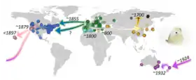 L'espèce a été introduite au Maghreb, en Islande, en Amérique du Nord (où elle est désormais répandue et commune du Canada au Nord du Mexique[5]), à Hawaï, aux Bermudes, en Australie et en Nouvelle-Zélande[6].