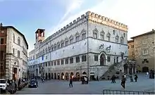 Sur le côté opposé se trouve le Palazzo dei Priori, un exemple d'architecture gothique. L'articulation des volumes, les asymétries et l'irrégularité du tracé, mettent en évidence la longue phase de construction, qui a duré de 1293-1297 à 1443 et l'utilisation de structures de bâtiments préexistants. Le palais est le siège de la municipalité de Pérouse et de la Galerie nationale de l'Ombrie. L'escalier en éventail mène à un grand portail qui donne accès à la Sala dei Notari. Au sommet se trouvent des copies du griffon de Pérouse et du lion guelfe, les deux symboles de la ville, dont les originaux se trouvent à l'intérieur du palais. Le Palazzo dei Priori s'étend le long du Corso Vannucci. Au rez-de-chaussée se trouvent la Sala del Collegio della Mercanzia et le Collegio del Cambio[1].