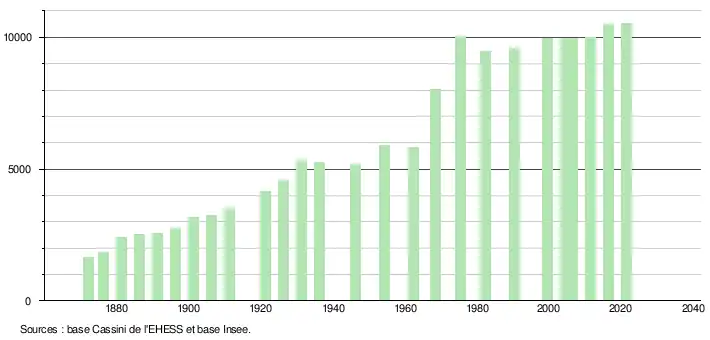 - Par convention dans Wikipédia, le principe a été retenu de n’afficher dans le tableau des recensements et le graphique, pour les populations légales postérieures à 1999, que les populations correspondant à une enquête exhaustive de recensement pour les communes de moins de 10 000 habitants, et que les populations des années 2006, 2011, 2016, etc. pour les communes de plus de 10 000 habitants, ainsi que la dernière population légale publiée par l’Insee pour l'ensemble des communes.