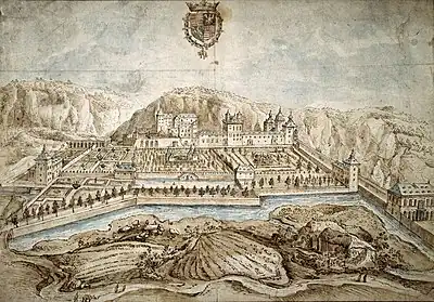 Le châtelet d'entrée (à l'extrême-droite sur le dessin) mène par une longue allée au château. En façade sur la terrasse haute des jardins, on trouve la maison oblongue, avec au rez-de-chaussée le salon des arts, à l'étage la grande galerie (41 x 6), qui est à la fois galerie des batailles et galerie des illustres[27]. Cette idée de galerie des illustres vient peut-être du château de Beauregard, une réalisation antérieure dessinée par Androuet du Cerceau et donc vue par Mansfeld. Comme par hasard, le portrait de ce dernier est dans la galerie de Beauregard [28]! La maison oblongue mène au grand logis, en forme de tour, de trois étages plus un toit-terrasse sur lequel est installé l'appartement de Mansfeld (une grande salle et deux tourelles)[29], une idée fort moderne... A l'arrière-plan, on trouve encore le vieux logis, habitation précédente du maître des lieux.