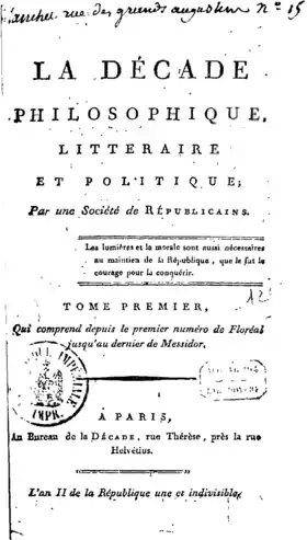- Joanna Kitchin, Un journal « philosophique » : La Décade, 1794-1807, Paris, F. Paillart, , 315 p. (lire en ligne), p. 265.