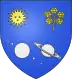 « D'azur, aux deux planètes de Jupiter et de Saturne avec leurs satellites et anneaux d'argent, placés en ordre naturel vers le bas de l'écu ; en chef à dextre un soleil d'or, et à sénestre une fleur à cinq branches du même. »[50],[43],[24],[48] |