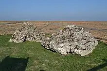 Au nord, l'édifice se prolongeait par une plate-forme de 2,50 m à 3 m de large sur 0,50 m à 0,60 m de hauteur entièrement dallée qui se prolongeait à l'est par une petite rampe plus étroite à faible pente. L'existence de trous de poteaux découverts dans les lignes de pierre et sur la plate-forme située au nord suggère que la structure ainsi délimitée aurait été couverte et qu'on y accédait au nord-est par la petite rampe. Cet ensemble mégalithique n'est pas un dolmen[1].