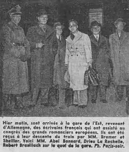 En octobre 1941, Drieu la Rochelle participe au voyage en Allemagne d'une délégation d'écrivains français répondant à l'invitation de Goebbels[46]. Y participent également : Robert Brasillach, Abel Bonnard, Ramon Fernandez, Marcel Jouhandeau, Jacques Chardonne. Une photographie célèbre a fixé quelques-uns d'entre eux à leur retour à Paris.