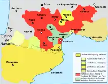 Le royaume d'Aragon était fortement implanté dans le Midi du royaume de France : le roi aragonais est l'héritier de la politique comtale barcelonaise qui, depuis le milieu du XIe siècle, s'était étendu au-delà des Pyrénées, contre les ambitions des comtes de Toulouse. Les rois d'Aragon étaient comtes de Carcassonne et du Razès en titre, même si leurs vassaux, les vicomtes Trencavel, prêtaient hommage alternativement aux comtes de Toulouse et aux rois d'Aragon afin de préserver leur indépendance. Plusieurs autres seigneurs reconnaissaient la suzeraineté du roi d'Aragon, tels que le comte de Comminges, le comte de Bigorre et le vicomte de Béarn. Les autres territoires au nord des Pyrénées, les comtés de Provence, du Gévaudan et de Millau avaient été cédés à son frère Alphonse.