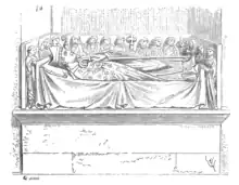 « La statue, couchée sur un lit drapé, est entourée de figurines en ronde bosse représentant les religieux assistant aux funérailles de l’évêque. Parmi ces religieux, on distingue l’abbesse de Fontevrault et un abbé, tous deux tenant la crosse, signe de leur dignité. Les autres personnages portent des croix et des cierges.