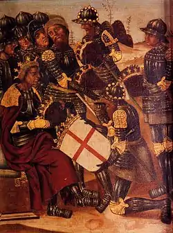 D'après la légende, le saint serait apparu sur le champ de bataille à Alcoraz. Les têtes de quatre musulmans décapités trouvées sur le champ de bataille et ajoutées à la croix afin de former la croix d'Alcoraz (es), toujours présentes dans les armoiries de l'Aragon.