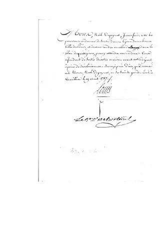 « Mons, Noël Dupeyrat, je vous fais cette lettre pour vous ordonner de sortir dans le jour de ma bonne Ville de Paris, et de vous rendre en celle de Troyes, dans le délai de quatre jours, pour y attendre mes ordres : Vous défendant de sortir de votre maison avant votre départ à peine de désobéissance. Sur ce je prie Dieu, qu’il vous ait, Mons, Noël Dupeyrat, en sa sainte garde. » Écrit à Versailles le Louis XVI.