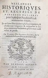 Cet érudit provincial écrivit notamment une histoire des Bourguignons, publiée alors qu’il était doyen de Chalon-sur-Saône : « De l’origine des Bourgongnons, et antiquité des estats de Bourgongne », ouvrage imprimé en 1581 « à Paris, chez Nicolas Chesneau, ruë Sainct Jacques, au Chesne Verd »[2].