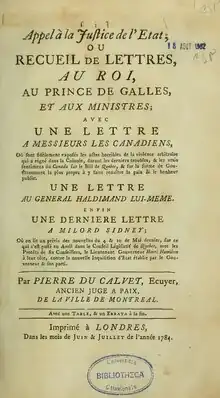 Travaillant à une version française, il emploie alors Pierre Roubaud comme secrétaire. Vivant chez lui, Roubaud note et transmet toutefois en secret à Haldimand les arguments et les documents que du Calvet veut utiliser dans sa poursuite contre lui[27]. En juillet, du Calvet publie malgré tout Appel à la justice de l'État. Il s'agit d'un recueil d'un peu plus de 300 pages regroupant une douzaine de lettres (au roi et au prince de Galles entre autres) et des pétitions[28]. Son « Épître aux Canadiens » interpelle ses compatriotes. Du Calvet fait le portrait du gouvernement « tyrannique[24] » d'Haldimand et plus largement, il demande une réforme constitutionnelle. « Ma cause est celle de la province de Québec, comme celle de la province de Québec est la mienne[29] », soutient-il. Or,