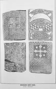 - Classe 2. Pierres de forme plus ou moins rectangulaire avec une grande croix et des symboles sur au moins un côté. Les symboles, tout comme les motifs chrétiens, sont taillés et l'espace de la croix avec son décor est rempli de dessins. La période est du VIIIe et IXe siècle.