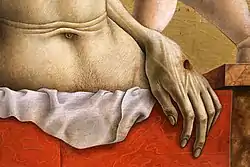 La dérivation de certains détails se réfèrent à Andrea Mantegna, comme la physionomie des anges, la recherche de la perspective des dalles sur lesquelles ils reposent et la façon de « sculpter » la draperie avec des ombres et des lumières qui rappellent la consistance de la pierre plutôt que du tissu. La tentative de percer l'espace peint est également typique, en plaçant des éléments, dans ce cas une bande de linceul et la main gauche de Jésus, au-delà de la limite inférieure du bord du tombeau.