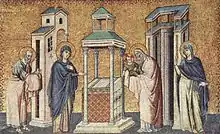 Dans la Présentation au Temple, les hommes ont un geste d'offrande, les femmes une attitude plus personnalisée et leur alternance crée une animation relative du mouvement. La petite taille des cubes de la mosaïque autorise une subtilité plus nette des rythmes colorés (ombre de la robe, travail du drapé sur l'autel, modelé des visages). L'espace obéit à une disposition rigoureuse héritée sans doute des mansions des sacre rappresentazioni. Mais les édicules sont ici à mi-chemin entre la représentation symbolique et la structure tridimensionnelle ; servant aussi de support plastique aux figures par rapport au fond d'or, elles contribuent à instaurer un espace par la superposition relative des objets et des figures[8].