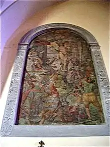 - Sur la paroi droite de la nef se trouve une fresque attribuée à Raffaellino del Colle, représentant le Martyre de saint Sébastien.