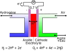 Le principe de la pile à combustible est inverse de celui d'une électrolyse[10]. La réaction chimique produite par l'oxydation et la rencontre de gaz produit de l'électricité, de l'eau et de la chaleur. Le fonctionnement de la pile à combustible nécessite un approvisionnement en combustible, le plus utilisé étant l'hydrogène. Une cellule de pile à combustible produit une tension électrique d'environ 0,7 à 0,8 V[11], selon la charge (densité de courant) et produit de la chaleur. Leur température de fonctionnement varie de 60 à 1 050 °C selon les modèles[2]. L'eau est généralement évacuée sous forme de vapeur avec l'excédent de dioxygène.