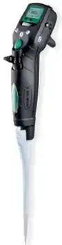 Le manche de la micropipette contient un moteur électrique qui effectue le pistonnage. Des boutons permettent d'effectuer une programmation à l'aide d'un écran à cristaux liquides. Il est possible alors de distribuer par exemple 100 µL de liquide autant de fois que possible pour compléter les microtubes d'une microplaque. Un gros bouton permet de lancer le programme entré de pipetage. Le repose-pipette, relié au secteur, sert de base de rechargement de la batterie de l'appareil.
