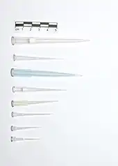 Il est nécessaire d'avoir des embouts (cônes de pipettes) qui soient adaptés à la micropipette utilisée. Ces embouts doivent être le plus effilés possible, notamment pour les petits volumes, afin de mieux voir le volume prélevé. Ils sont généralement disposés dans des boites stérilisables, munies d'un plateau percé, où l'on les met.