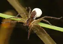 Les mâles sont présents dès le mois d'avril jusqu'en juillet et les femelles de mai à septembre. Les femelles pondent en général deux cocons dont un premier avant l'été. Ces derniers renferment en moyenne 45 œufs mais ce nombre reste très variable. Le second cocon contient en général moins d'œufs[6]. La femelle porte son cocon accroché à l'arrière de l'abdomen, sur les filières. Celui-ci est porté environ deux semaines. Après éclosion, les jeunes sont portés sur le dos de l'abdomen de la mère pendant quelques jours jusqu'à leur dispersion. Les juvéniles issus du second cocon et donc nés à la fin de l'été hivernent une première fois en tant que juvéniles (pas encore différenciés sexuellement) et une seconde fois en tant que subadultes avant d'atteindre le stade adulte au printemps. Ils passent donc un second hiver en tant que subadultes[7].