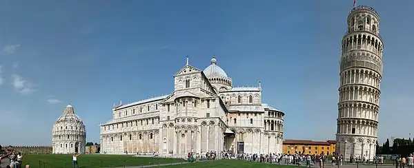 - Le Duomo (la cathédrale de Pise) : commencée en 1064 et achevée au milieu du XIIe siècle, elle est caractéristique du style roman pisan (it). L’extérieur est recouvert de marbre vert et blanc et la façade est remarquable par ses quatre rangées d’arcatures aveugles. L’intérieur est composé d’une nef à cinq vaisseaux. La voûte de l’abside est décorée d’une grande mosaïque du XIVe siècle représentant un Christ Pantocrator. Autre élément remarquable, la chaire réalisée par Giovanni Pisano entre 1302 et 1311.