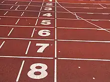 D'autres marquages identifient les distances remarquables (tous les 100 mètres notamment), les repères pour les courses courtes sur plusieurs couloirs. La distance de 400 m du premier couloir se mesure à 30 cm du bord intérieur de la piste lorsque celle-ci comporte une bordure, mais si c'est une simple ligne, la mesure s'effectuera à 20 cm du bord. En effet, un coureur prend plus de marge lorsqu'il court près d'une bordure (5 cm de haut et revêtement dur et glissant), alors qu'il court plus facilement le long d'une ligne. De ce fait, le décalage entre le couloir 1 et 2 est de 7,04 m alors que pour tous les autres, il est de 7,66 m (règlement juge arbitre IAAF). Il y a des marques pour la position des haies, vertes pour le 400 mètres haies (à 45 m du départ puis tous les 35 m), bleues pour le 110 mètres haies (9,14 m), jaunes pour le 100 mètres haies (8,50 m), blanches (8 m), rouges (7,50 m), des marques pour le début et la fin de la zone de transmission du témoin pour les courses de relais : le chiffre 1 en jaune symbolisant le début de la zone de par l'orientation de la barre du chiffre 1, et à 30 m de l'entrée de zone de transmission un chiffre 1 retourné symbolisant la sortie de zone de transmission[8]. Ces marquages ont tous comme point de repère la ligne d'arrivée.