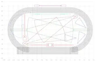 Les distances sont celles mesurées à 30 cm à l'intérieur du couloir pour le couloir no 1 et à 20 cm à l'intérieur du couloir pour les couloirs suivants. Le périmètre exact de la piste standard à la corde est de 398,12 mètres : longueur de 84,39 mètres et rayon de courbure de 36,50 mètres.
