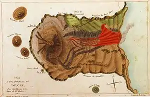 « … obronde, de cent toises environ de diamètre, et de cent vingt pieds de profondeur ; ses parois étaient formées de couches horizontales distinctes, rouges et comme interrompues : entre plusieurs de ces couches, sortaient des vapeurs qui avaient l'odeur de l'acide vitriolique fumant. Le fond n'était qu'un amas de scories et de débris, d'où s'échappaient çà et là des fumées sulfureuses qui avaient coloré en jaune plusieurs parties de la fournaise[18]. »