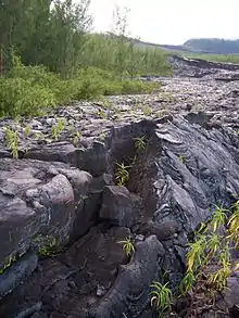 Certaines coulées qui sont alimentées abondamment ou qui proviennent d'éruptions à basse altitude atteignent le rivage et se jettent dans l'océan. Le contact avec l'eau salée provoque un panache de vapeur d'eau condensée et la formation de gaz irritants, notamment d'acide chlorhydrique. Les laves qui continuent à s'écouler et à s'ébouler sous l'eau se refroidissent en formant des pillow lavas, tandis qu'une plate-forme rocheuse se construit peu à peu agrandissant le contour terrestre de l'île.