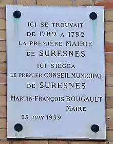 Au niveau de l'actuelle intersection avec la rue Émile-Zola se trouvait le domicile du premier maire de Suresnes, Martin-François Bougault, transformé en mairie durant son mandat qui se déroule au début de la Révolution française. Le bâtiment originel a depuis disparu mais une plaque apposée en 1939 rend hommage au premier conseil municipal qui s'y tint[5],[6].