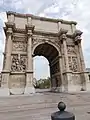 Cependant la construction de cet arc de triomphe subit encore les vicissitudes de l'histoire. Commencé sous Charles X, il ne fut terminé que sous Louis-Philippe Ier par l'architecte en chef de la ville Charles Frédéric Chassériau. À la suite des nombreux changements de régime, l'arc ne pouvait plus célébrer la campagne du duc d'Angoulême dans les deux bas-reliefs placés sous l'arcade; David d'Angers choisit alors comme motif "la patrie appelant ses enfants à la défense de la liberté", et Jules Ramey "le retour des braves après la victoire".