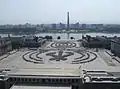 Des portraits de Kim Il-sung et Kim Jong-il sont affichés sur les bâtiments autour de la place ainsi que d'autres de Karl Marx et de Lénine.