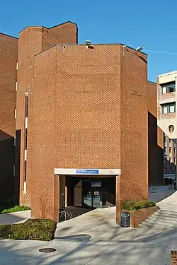 Un auvent en béton, qui court sur les quatre travées de droite, abrite les entrées principales[2]. Ce auvent est soutenu par le dessus par cinq triangles de « béton brut » percés chacun d'un grand oculus