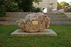 Ce bloc, disposé sur une pelouse en terrasse devant le bâtiment mercator, porte une plaque dorée affichant :