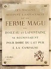 Une plaque au no 9 mentionne qu'au XVIIe siècle s'y trouvait un établissement agricole, la ferme Magu (détruite en 1904), où Boileau et La Fontaine avaient l'habitude de venir boire du lait frais[1].