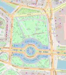 Une grande partie de la place est occupée par un parc et son centre est orné d'une fontaine monumentale entourée d'un grand bassin. L'auberge de Manuc (Hanul lui Manuc) est située au nord de la place.