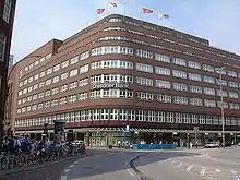 La Commerzbank (Orientation nord-est) - Le troisième angle arrondi (occupé par une filiale de la Commerzbank désormais fermée) est créé en 1985/1986 pour rappeler les deux grands complexes en briques opposés.