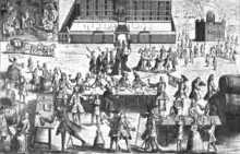 Au XVIIIe siècle, la place sert aux réjouissances publiques[1]. Sur une estampe, intitulée L’auguste réjouissance de Fontainebleau faite à Locasion du Mariage du Roi et de la Princesse Marie (Louis XV et Marie Leszczynska), on voit des tréteaux dressés pour boire et manger, des tonneaux, des joueurs de violon, de cymbales, de tambourin, des gens qui dansent, le Parlement qui défile, grave, au milieu de la foule ; dans un angle, un feu d’artifice ; au dernier plan, le Roi et la Reine, en haut de l’escalier en Fer-à-Cheval, ainsi que dans un guignol[1],[4]. Comme légende, Sur l’aire vive le Roy, plusieurs couplets dont le premier est ainsi énoncé[4] :
