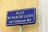 Les dénominations de la place du Marché-Gayot n'ont cessé de changer avec les régimes politiques et les langues officielles, insistant tantôt sur son créateur, sur sa destination ou sur le souvenir de l'incendie d'autrefois : Nouveau Marché ou Petit Marché-Neuf (1780), Marché aux Volailles (1795), Gayot-Markt auf dem verbrannten Hof (« Marché Gayot dans la cour brûlée » (1817), place du Marché-Gayot (1856), Auf dem Verbrannten Hof (1872), Verbrannter Hof (1893), place du Marché-Gayot (1918), Verbrannter Hof (1940), place du Marché-Gayot (depuis 1945[1]).