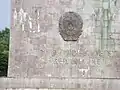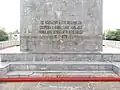 - Trois personnes dont deux hommes et une femme tenant en main des armes et le drapeau du Bénin. Le nu, l’expression marquée des visages et le mouvement des statues des trois personnes réalisées en béton expriment bien le mélange du style antique à celui de la révolution ;