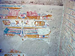 Au centre du plus grand fragment est représenté le sarcophage du roi, dépeint au centre d'un cartouche, entre la déesse funéraire Isis et Nephtys - déesse protectrice des morts et veillant sur les sarcophages. Le dessin est tracé à la pointe de pinceau, avec de l'encre noire et sur le fond blanc. Sur le recto on peut aussi lire des légendes, toujours en hiératique, qui décrivent les mesures et la décoration des chambres de la tombe, ainsi que des notes techniques sur la taille et la peinture des murs.