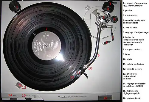 Certaines platines haut de gamme disposent d’un système de réglage fin de la vitesse de rotation du plateau. Outre le traditionnel bouton de sélection de vitesse 33⁄45 tours présent sur la quasi-totalité des platines récentes (cf. illustration ci-dessous, N°14), la vitesse du moteur peut être légèrement accélérée ou ralentie afin d’obtenir une vitesse de rotation optimale du disque. Des repères apposés sur le plateau permettent de déterminer la vitesse de rotation optimale par effet stroboscopique: Lorsque le plateau tourne, une petite lumière branchée sur le secteur (donc dont l’intensité varie à 100 Hz = 2×50Hz, ou 120 Hz = 2×60Hz dans certains pays) et dirigée sur le côté du plateau grâce à un prisme éclaire les repères chromés. Ceux-ci défilent et, pour indiquer un bon réglage de la vitesse, doivent donner l’impression d’être immobiles à l’œil de l’utilisateur, comme si le plateau était à l’arrêt. Si les repères ont l’air d’avancer ou de reculer, la vitesse n’est pas optimale et il convient de la corriger en conséquence. Les repères n’ont pas le même espacement pour la vitesse 45 tours ou pour la vitesse 33 tours (voir illustration ci-dessous, N°13 et N°15).