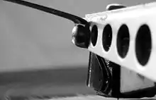 - (no 3) Le contrepoids, qui sert à régler la pression de l’aiguille de lecture (de l’ordre de 1 ou 1,5 g pour des cellules de qualité ; rarement plus de 3 g)