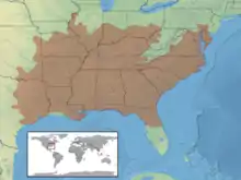 Cette espèce est endémique des États-Unis. Elle se rencontre dans l'est du Texas, dans l'est de l'Oklahoma, dans le Missouri, dans l'Arkansas, en Louisiane, dans le sud de l'Illinois, dans le Sud de l'Indiana, dans le Kansas, dans le Sud de l'Ohio, dans le Kentucky, en Virginie, dans le Maryland, en Virginie-Occidentale, dans le Delaware, dans le New Jersey, dans le Tennessee, en Caroline du Nord, dans le Mississippi, dans l'Alabama, en Géorgie et dans le nord de la Floride[1].