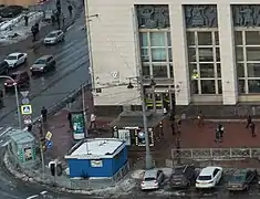 La gare de Finlande avec l'entrée sud de la station du métro dans l'angle droit du bâtiment de la gare et son pavillon d'accès nord que l'on aperçoit devant la façade du grand bâtiment blanc à gauche. | ||||||||