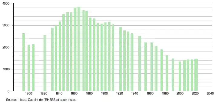 L'évolution du nombre d'habitants est connue à travers les recensements de la population effectués dans la commune depuis 1793. Pour les communes de moins de 10 000 habitants, une enquête de recensement portant sur toute la population est réalisée tous les cinq ans, les populations légales des années intermédiaires étant quant à elles estimées par interpolation ou extrapolation[35]. Pour la commune, le premier recensement exhaustif entrant dans le cadre du nouveau dispositif a été réalisé en 2005[36].