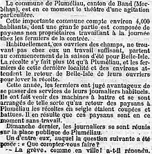 Victimes de leur remplacement par des machines à battre lors des moissons, des journaliers de Pluméliau se mirent en grève en 1901, menaçant de briser les machines et piller les champs. Le journal Le Temps écrit : « La situation des journaliers de Pluméliau est des plus précaires. Ils gagnent un franc par jour et sont nourris ; le salaire des femmes est de 50 centimes, plus la nourriture. Ils habitent des chaumières construites en planches, en terre, quelquefois même avec des branchages entrelacés. Ils se nourrissent de lait caillé , de bouillie d'avoine, de pommes de terre »[22].
