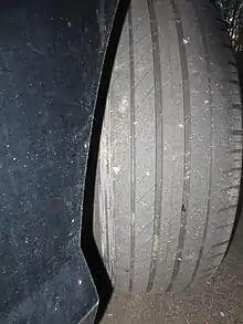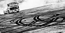 - Slick : les pneus slick (lisses) sont utilisés en compétition, par exemple automobile ou motocycliste, par temps sec. Ils sont aussi appréciés des cyclistes. La bande de roulement est sans rainure ce qui permet de maximiser la surface en contact avec le sol et de minimiser les déformations de la bande de roulement[alpha 5] et donc d'améliorer la résistance au roulement. L'utilisation de gommes tendres permet d'améliorer l'adhérence (mais leur usure est d'autant plus rapide). Par contre, sur sol humide, l'adhérence est fortement altérée par le phénomène d'aquaplanage, une pellicule d'eau se formant entre la route et le pneumatique. Dans de telles conditions, les pilotes utilisent des pneus pluie[14]. En dehors des vélos, les slicks sont interdits sur la voie publique.