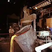 Poche droite en cours de vidange dans des lingotières. Le contrôle du débit d'acier se fait avec une quenouille.